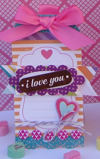 I used an old botttle that some flowers had come in and wrapped it with some Echo Park papers. I filled it up with Conversation Heart Candies and added some Heart Suckers for flowers.